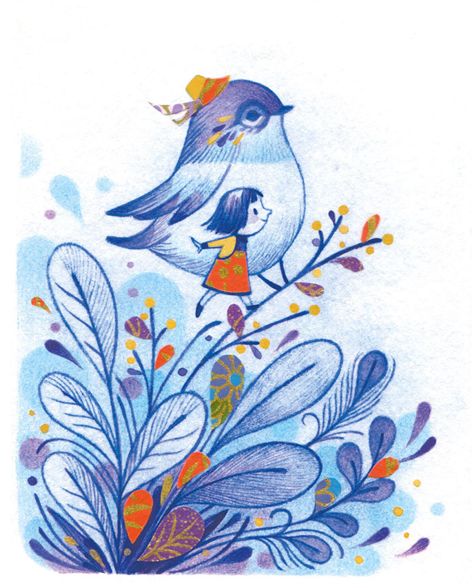 Drypoint etching is a versatile medium that can be combined with other elements once the prints dry. In this case I printed the design with an ultramarine ink and added colored pencil details and collage. The different palettes make for two very different original illustrations.